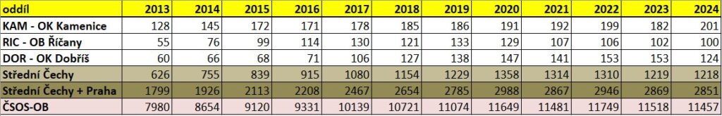 Velkou zajímavostí je to, že největším oddílem orientačního běhu v ČR už nejsou Pardubice, které na pomyslném trůnu seděly od nepaměti, ale Kotlářka Praha, mající 370 členů. Co na to asi Béďa? No, OB Říčany je stále třetí největší OB oddíl ve středních Čechách za Kamenicí (tam letos poprvé přesáhli 200 - konkrétně 201 členů) a Dobříší (124). Koho zajímají grafy a tabulky, tak něco je zde: Tabulka vývoje počtu registrovaných orienťáků ve Středních Čechách, v Praze a v ČR za posledních 12 let:
